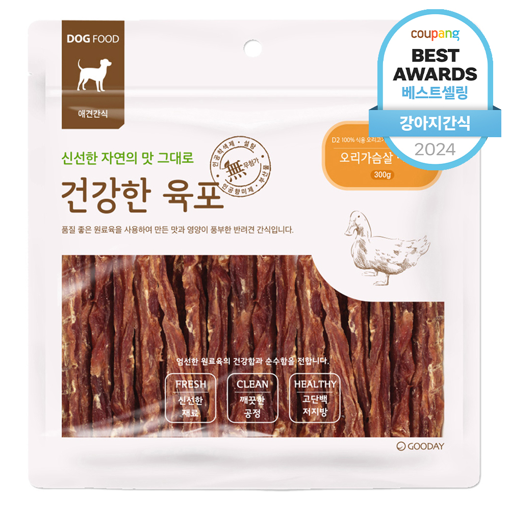 안녕하세요, 여러분! 오늘은 우리 강아지를 위한 특별한 간식을 소개하려고 합니다. 바로 굿데이 건강한 육포 강아지 간식인데요, 오리가슴살 스틱으로 만들어져, 강아지들이 정말 좋아하는 제품입니다. 300g 대용량으로 합리적인 가격에 제공되어 여러분의 반려견에게 행복한 간식 시간을 선사할 거에요.
